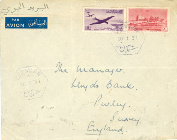 Lebanon: 1951 (10 January). Airmail cover to England franked with 15p. and 20p. stamps tied by CHEMLAN bilingual octagonal datestamps. Reverse next day Beyrouth transit cds.