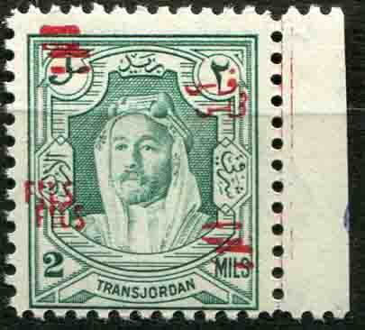 Jordan: 1952 (26 Feb). Overprinted on 1943-47 issues watermark Mult Script CA marginal 2f. on 2m. bluish green unmounted mint o.g with overprint double error. SG 314a