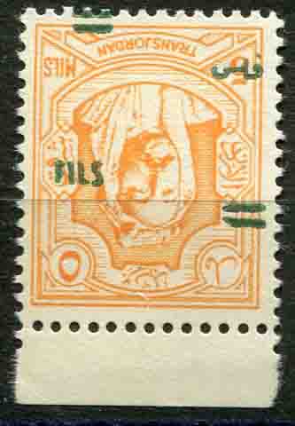 Jordan: 1952 (26 Feb). Overprinted on 1942 issue without watermark 5f. on 5m. yellow-orange marginal unmounted mint o.g. with inverted overprint error. SG 311a