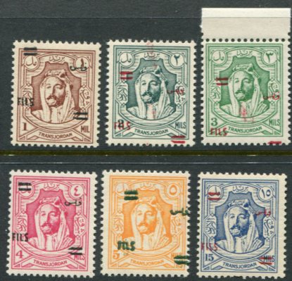 Jordan: 1952 (26 February). Emir Abdullah portrait of 1942 issue overprinted FILS value unmounted mint set. 15m patch gum resulting severe gum loss. Sg. 307/312.**