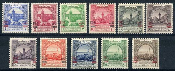 Jordan: 1952 new currency bilingual FILS with bars overprinted on 1947 obligatory tax stamps very fine mint / unmounted mint o.g. set of 11. Scarce 2f on 2m carmine and 1d on £P1 brown are unmounted mint along with few other values. Sg. T334/T344