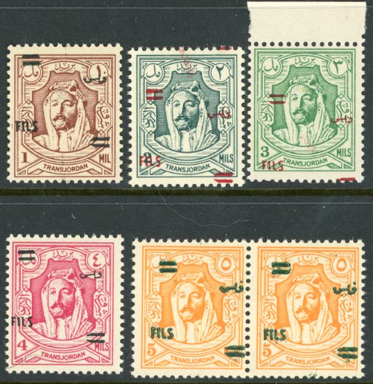 Jordan: 1952 (26 February). King Talal new currency surcharged on Emir Abdullah portrait unmounted mint values to 5f. on 5m. Sg. 307/311. **