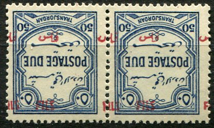 Jordan: 1952 (31 March). Postage Due pair of 50m blue wmk Mult Script CA of 1929 issue overprinted new currency FILS, unmounted mint with OVERPRINT INVERTED error. Sg. D346a