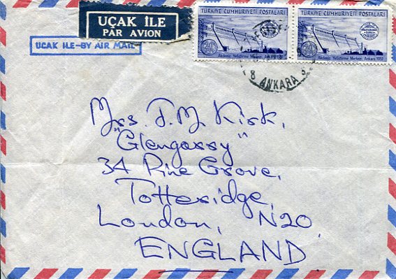 Turkey: 1952 (5 November). Airmail cover to England franked with pair of 20k UN Economic Conference, FAO stamps tied by Yenisehir, Ankara datestamps. Reverse blank.