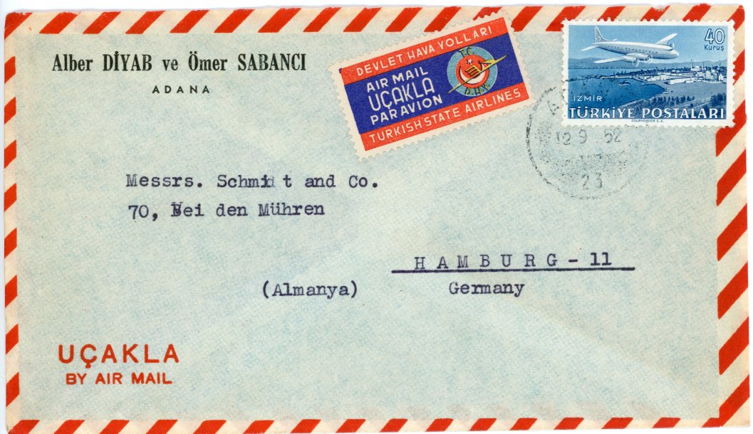 Türkiye: 1952 ‘Alber Diyab ve Ömer Sabanci’ imprinted airmail cover to Germany tied by Adana datestamp.