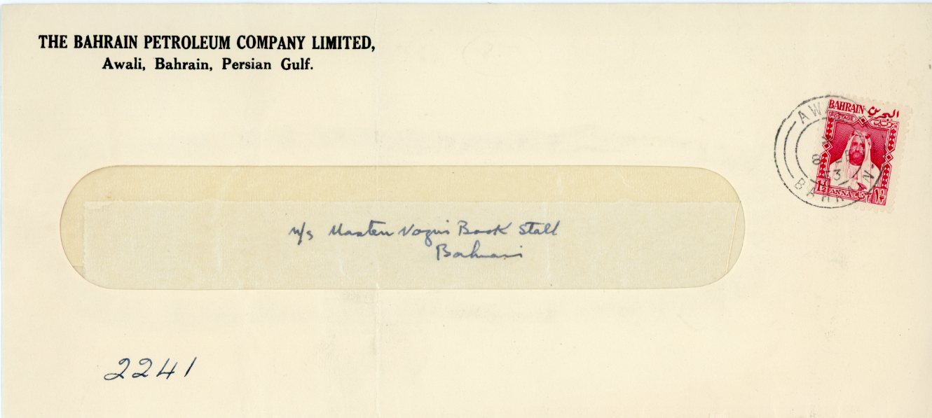 Bahrain: 1953 The Bahrain Petroleum Company Limited imprinted window envelope franked with 1 1/2an. local usage stamp tied by Awali datestamp.