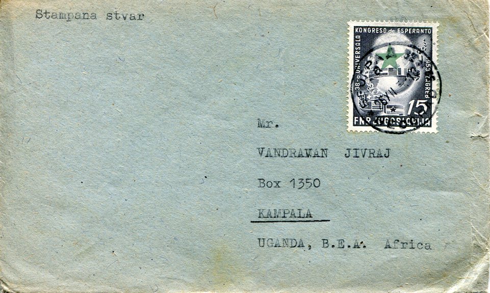 Yugoslavia: 1953 Esperanto Congress, Zagreb 15d cover from Belgrade to Kampala, Uganda, British East Africa.