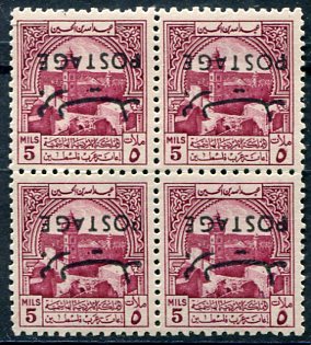 Jordan: 1953 (June). 5m claret without watermark perf. 11 1/2 x 12 1/2 obligatory tax stamps overprinted bilingual POSTAGE unmounted mint block of four with overprinted inverted error. Regular stamps as singles catalogue £800. 2019 RPSL certificate. Sg. 389 (unrecorded error) **