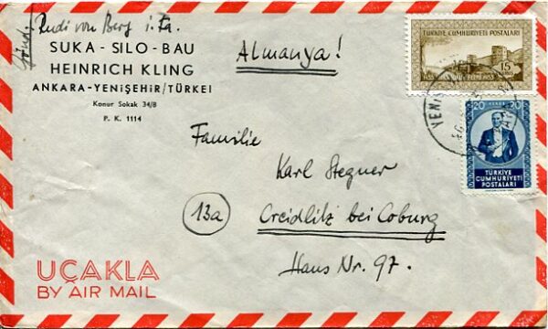 Turkey: 1953 (20 July). Heinrich Kling imprinted airmail cover to Germany franked with 15k Fifth Centenary of Capture of Constantinople and 20k Ataturk stamps tied by Yenisehir, Ankara datestamp. Reverse illegible cds’s.