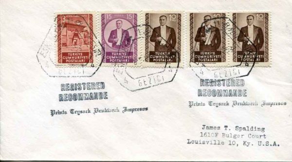 Turkey: 1953 philatelically inspired registered cover to United States franked with total of 48kr pictorial and Ataturk definitives tied by ESKISEHIR – BALIKESIR – GEZICI 4 TPO datestamps.