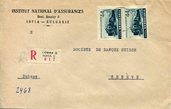 Bulgaria: 1954 registered National Insurance imprint cover to Switzerland franked with two of 44st Railway Workers day Steam Locomotive stamps tied by Sofia datestamp. Reverse 30 December Geneva arrival cds.