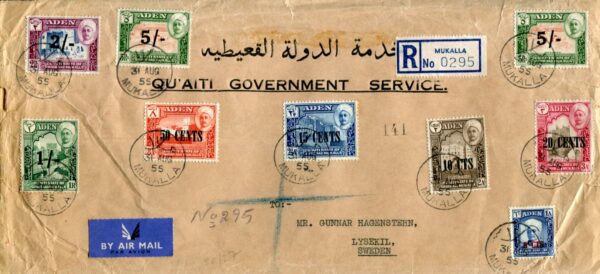 Aden – Qu’aiti State in Hadhramaut: 1955 (31 August). Registered Qu’aiti Government Service long cover to Sweden franked with complete set and additional 5s on5r of new currency surcharged on Sultan of Shihr and Mukalla pictorials tied by MUKALLA datestamps. Reverse 2 September Mukalla and next day Aden GPO transit and 7 September Lysekil arrival cds’s. stamps catalogue £120. Sg. 20/27