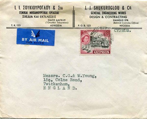 Cyprus: 1955 (30 September). Airmail commercial cover to England franked with 30m QEII stamp and tied by Nicosia cds.