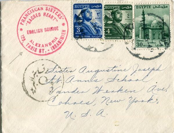 Egypt: 1955 cover from Ibrahimiyya to United States struck by Franciscan Sisters “Sacred Heart” Ibrahimieh English School hand cachet.