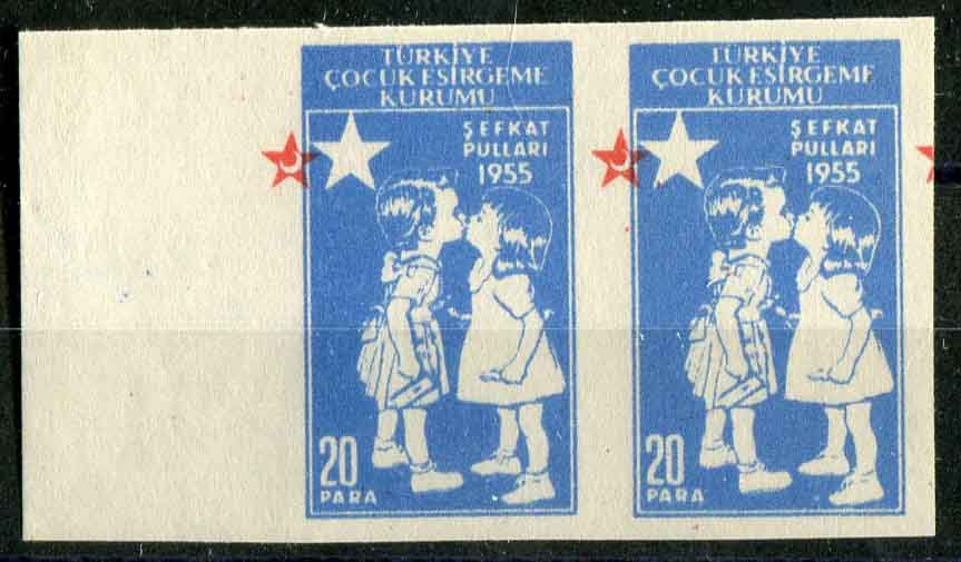 Children Welfare: 1955 (23 April). Turkish Children Welfare Society Charity stamps 20pa unmounted mint marginal imperforate pair also with misplaced red star error. Isfila C92var
