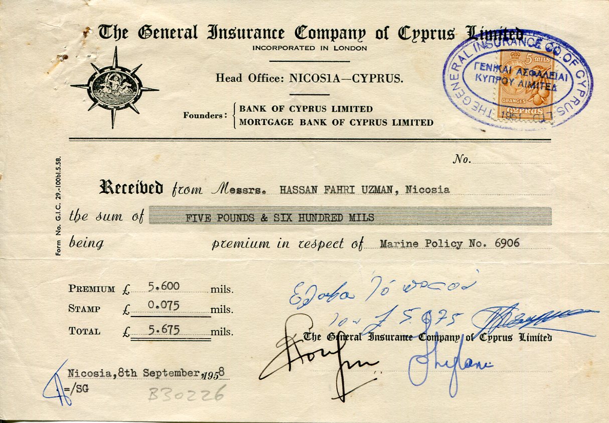Cyprus: 1958 Nicosia The General Insurance Company document with 5m QEII