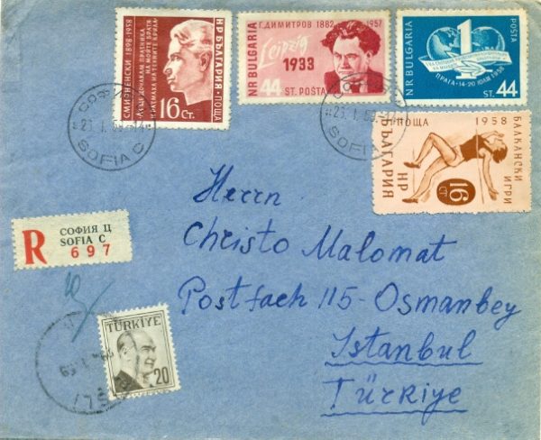 Bulgaria: 1959 (23 January) registered cover to Istanbul franked with four different commemorative stamps and tied by SOFIA C date stamps. On arrival 20kr Ataturk stamp applied.
