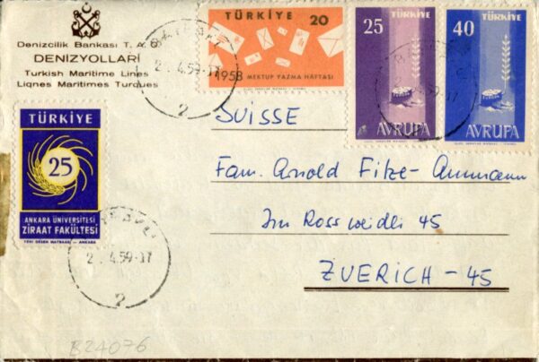 Turkey: 1959 (2 April). Turkish Maritime Lines folded picture lettercard to Zurich, Switzerland franked with 20k post week, 25k Faculty of Agriculture and Europa Cept of 1958 set commemorative stamps tied by Galata datestamps.