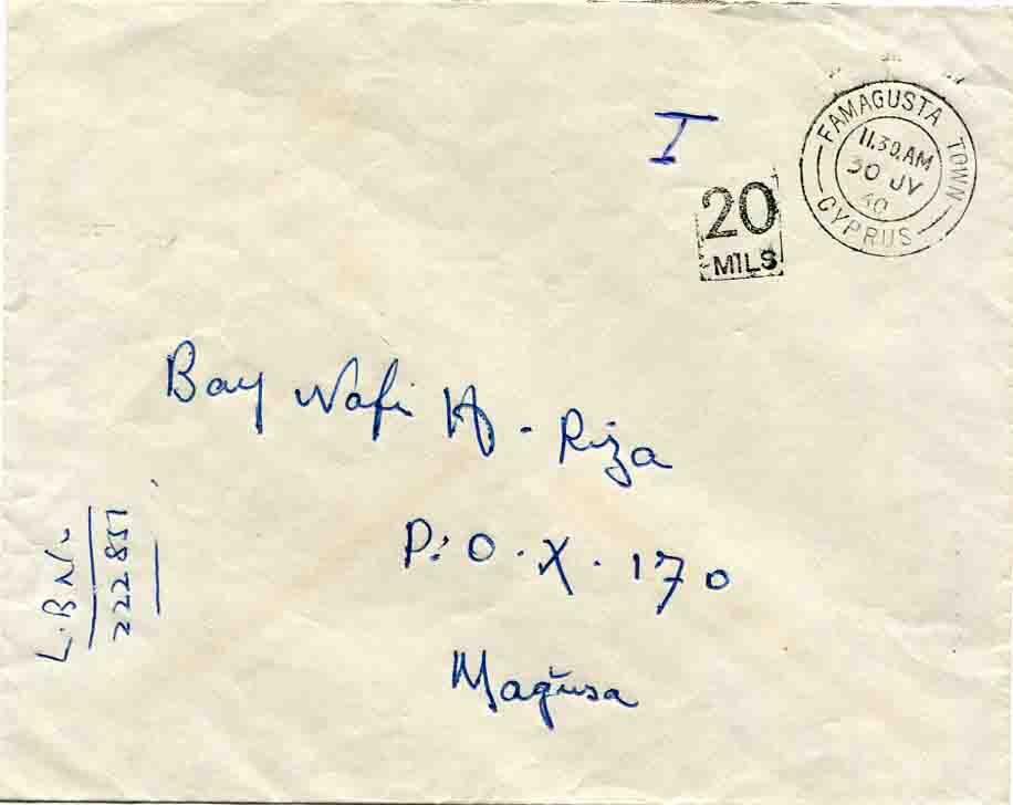 Cyprus: 1960 (30 July). Stampless cover used in Famagusta with boxed 20 MILS postage due handstamp and ‘T’ by manuscript. Philatelic but still scarce.