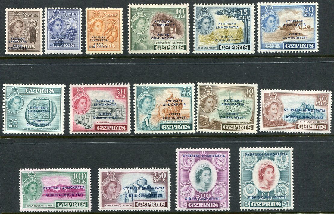 Cyprus: 1960 (16 August)-61. QEII pictorial stamps overprinted ‘Cyprus Republic’ mint o,g, set of 15. Sg. 188/202 *