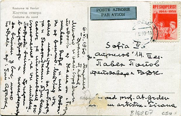 Albania: 1960 (8 November). North Albanian Costume postcard to Sofia, Bulgaria franked with 6,50l Laboratory stamp tied by Tirane 1 datestamp. Sc. 551