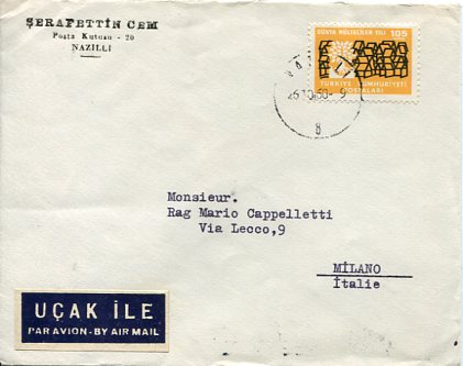 Turkey: 1960 (26 October). Commercial cover to Italy franked with 105k World Refugee Year issue tied by NAZILLI datestamp. Reverse 29 October Milano arrival cds.