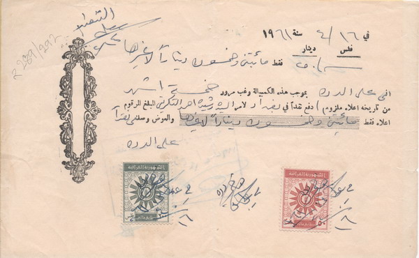 Iraq: 1961 document franked with 50f and 120f of Iraqi Republic Emblem revenue stamps. Ross & Powell 289, 292