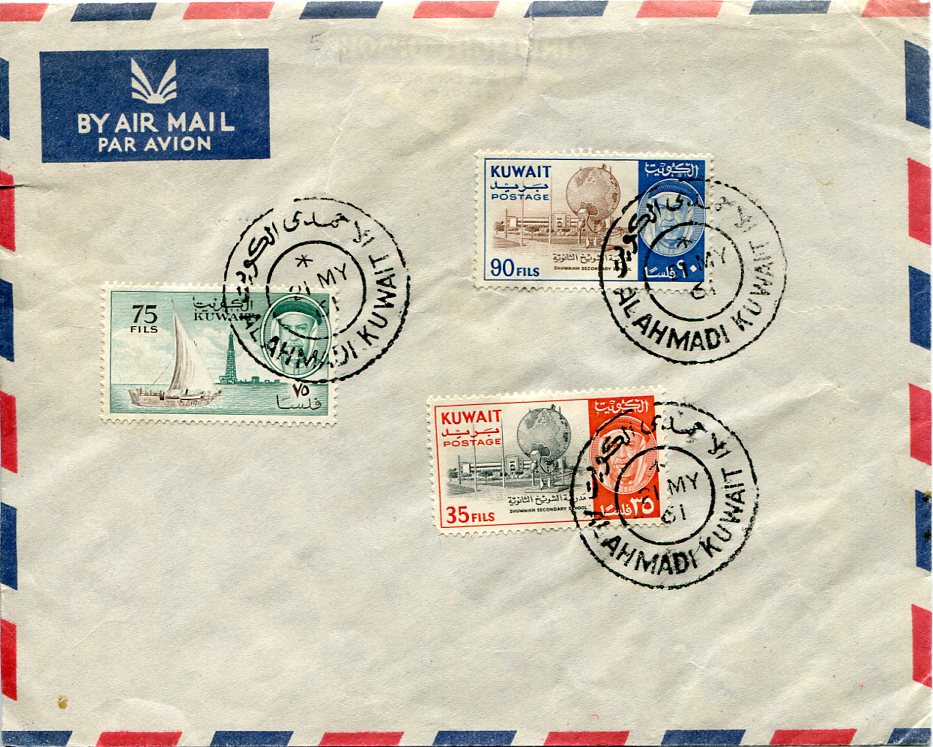 Kuwait: 1961 (21 May). Philatelic cover franked with 35f, 75f and 90f new currency pictorial stamps tied by Ahmadi datestamps.