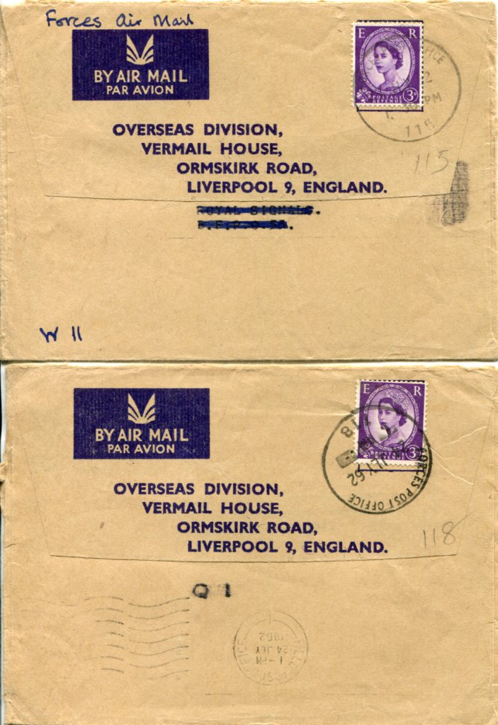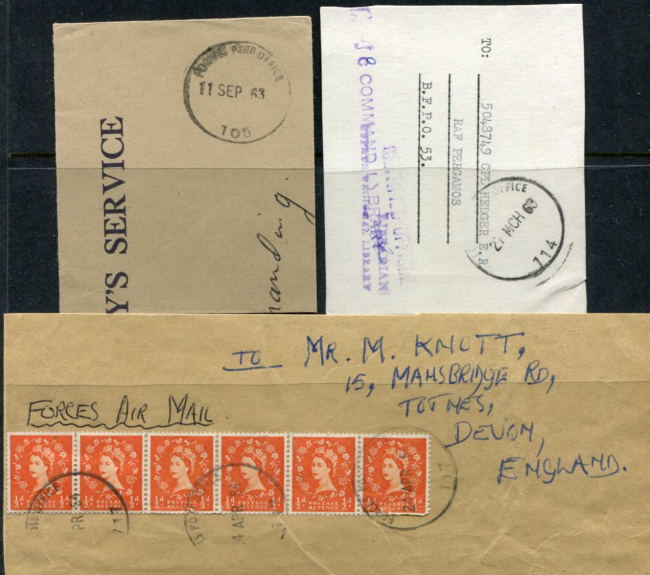 Cyprus: 1962-64 Forces Post Office FPO 105, 114, 115 and 118 datestamps. Two covers and three pieces.