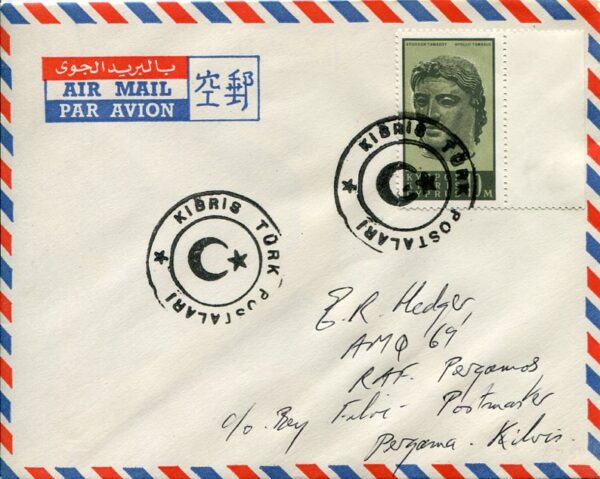 Turkish Cyprus: Cover addressed to RAF Pergamos camp postmaster Fikri Bey franked with 10m Apollo Tamasus of 1962 pictorial stamp tied by black undated KIBRIS TÜRK POSTALARI handcachets. Reverse blank.