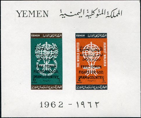 Yemen Royalist: 1962 (7 November). Overprinted on Malaria Eradication unmounted mint miniature sheets. Mi. Block 5, Sg. MS R12/R13