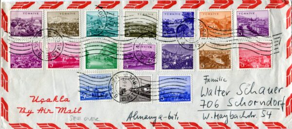 Turkey: 1963 (11 September). Cover to Germany franked with 27 different 5k Turkish Cities commemorative stamps tied by Bayazit, Istanbul datestamps.