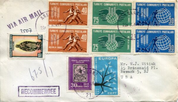 Türkiye: 1963 registered cover to United States franked with two sets of Fight for Hunger commemorative stamps and other pictorials as well as Istanbul 63 Stamp Exhibition label tied by 25 March New York arrival cds’s.