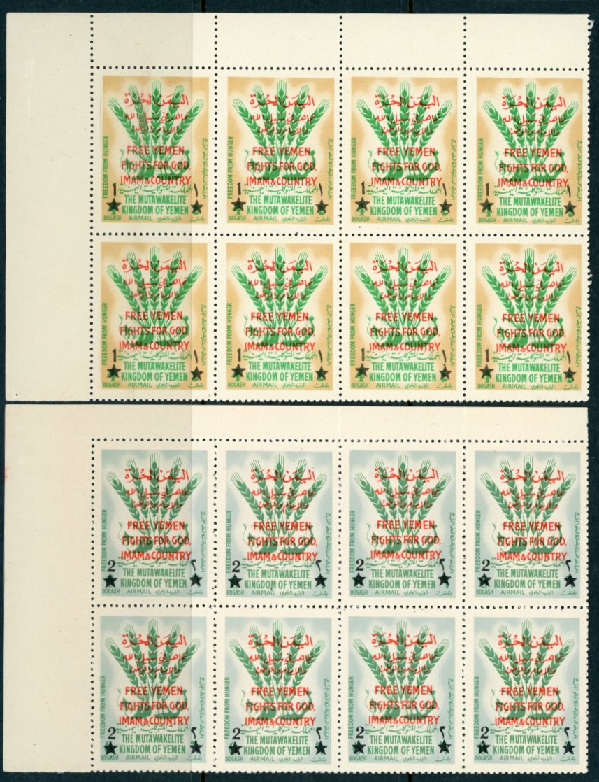 Yemen Royalist: 1963 (1 August). Overprinted on Freedom from Hunger issue unmounted mint block of eight set. Mi. 46/47, Sg. R26/R27