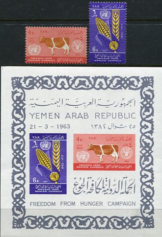 Yemen Republic: 1963 (21 March). Freedom From Hunger unmounted mint set and miniature sheet. Mi. 283/284, Bl.14 – Sg. 200/201, MS201a. **