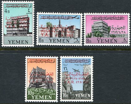 Yemen Republic: 1963 (1 January). Overprinted on Palaces issue unmounted mint set. Mi. 266A/270A, Sg. 186/190. **