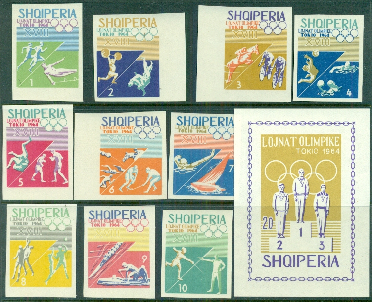 Albania – Republic. 1964 (25 September) Fourth Issue of Tokyo Olympic Games imperforate unmounted mint set. Only 17,000 sets issued. Mi. 870/879, Block 26B