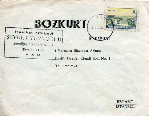 Türkiye: 1964 Bozkurt Kitabevi (Bookshop) imprinted cover to Istanbul franked with 50k Atatürk Mausoleum (Anitkabir) and tied by VAN datestamp.