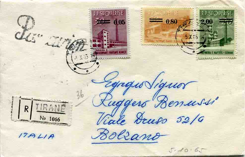 Albania: 1965 (5 October). Registered airmail cover to Italy franked with 0,05 on 30l, 0,80 on 50l and 2,00 on 20l surcharged new currency stamps of 1965 tied by Tirane date stamps. Reverse arrival cds. SG 927, 930, 932