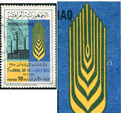 Iraq: 1965 (14 July). Seventh Anniversary of Revolution 10f fine used with blob on right of the wheat variety. Sg. 693