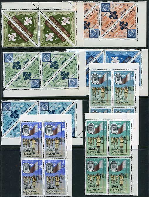 Qatar: 1965 (22 May). Qatar Scouts commemorative issue unmounted mint set of 8 in marginal block of four. Sg. 54/61, Mi. 53A/60A