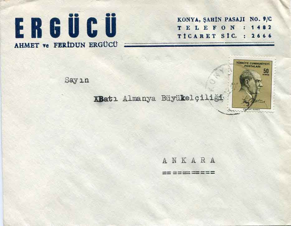 Turkey: 1965 commercial cover to German Embassy at Ankara franked with 50 Ataturk definitive and tied by KONYA datestamp.