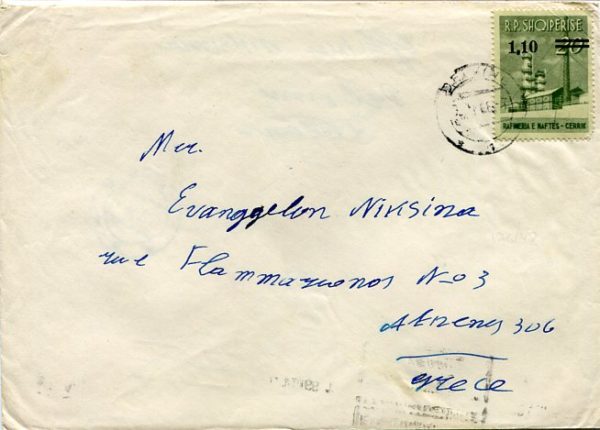 Albania: 1966 (July). Cover with its contents to Greece franked with 1,10l surcharged on 20l Industrial Development tied by Delvine datestamp. Reverse 1 August Tirane transit and 17 August Athens arrival cds’s. Sc. 845
