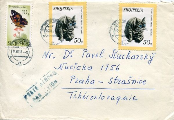 Albania: 1966 (14 August). Cover to Czechoslovakia franked with 10q Butterfly and two 50q Cats commemorative stamps tied by Korce datestamps. Sc. 907, 922