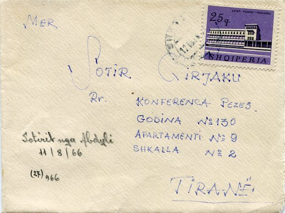 Albania: 1966 (12 August). Cover with its contents to Tirane franked with 25q Pogradec Rest Home stamp and tied by Shkoder datestamp. Sc. 871, Sg. 957
