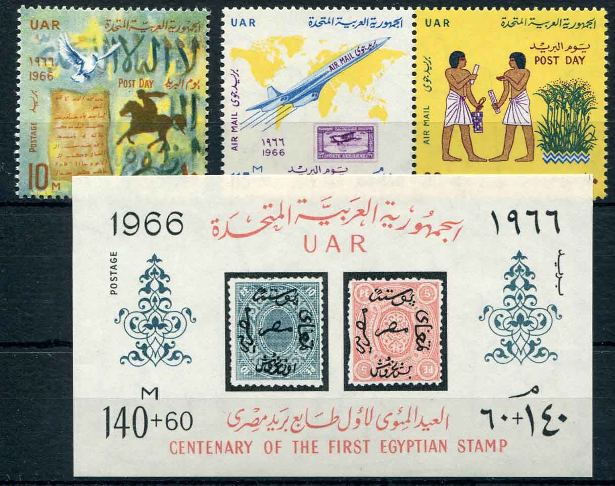 Egypt: 1966 (2 Jan). Post Day and Centenary of First Egyptian Postage Stamps issue unmounted mint set and miniature sheet. Sg 870/872, MS873