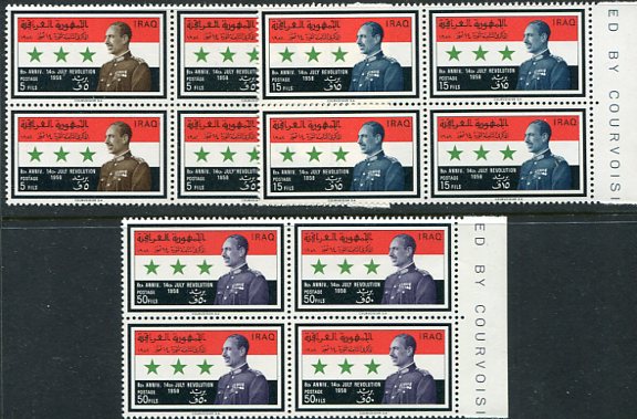 Iraq: 1966 (14 July). Revolution anniversary, President Arif unmounted mint block of 4 set. Mi. 453/455, Sg. 726/728
