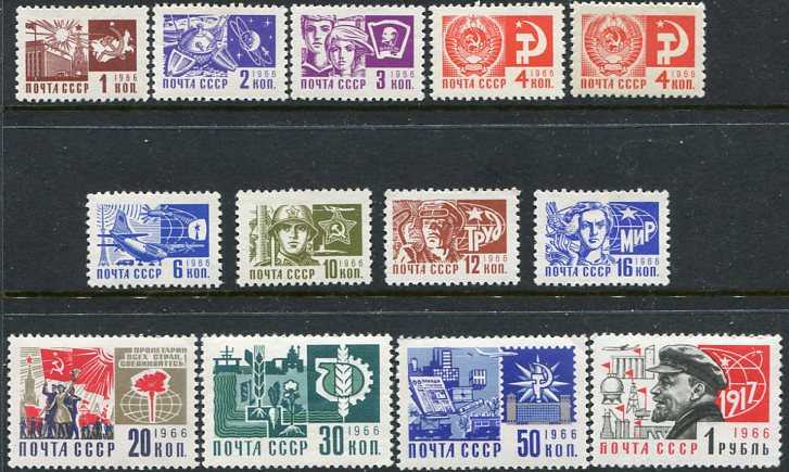 Russia – USSR: 1966 (25 October – December). Definitive issue including 4k fluorescent paper unmounted mint set. Sg. 3347/3358