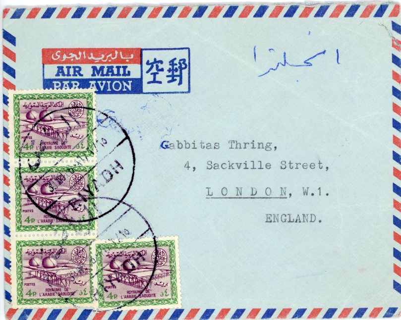 Saudi Arabia: 1966 cover from Riyadh to England franked with four 4p Gas Oil Plant.