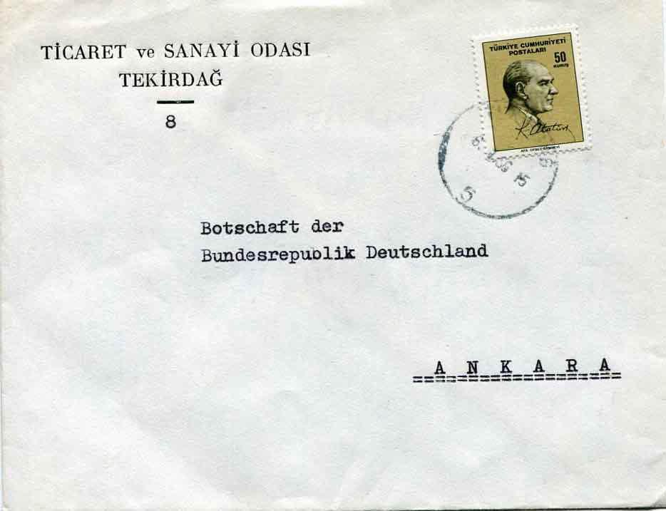 Turkey: 1966 Chamber of Commerce cover to German Embassy at Ankara franked with 50k Ataturk definitive and tied by TEKIRDAG datestamp.